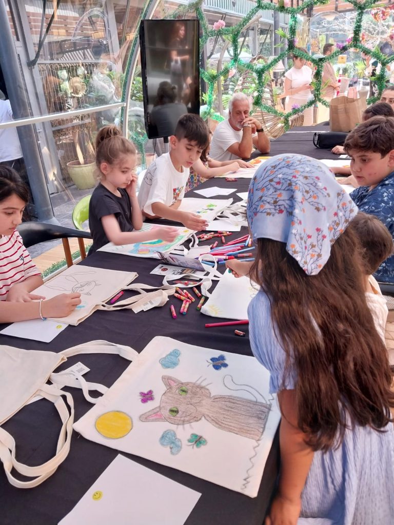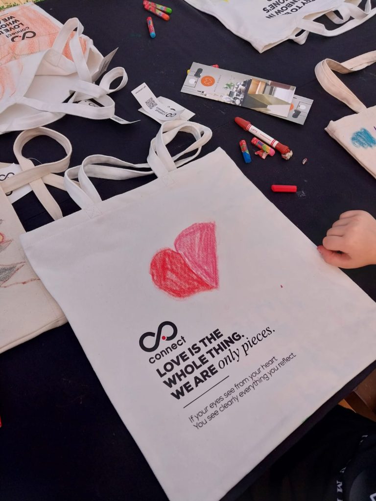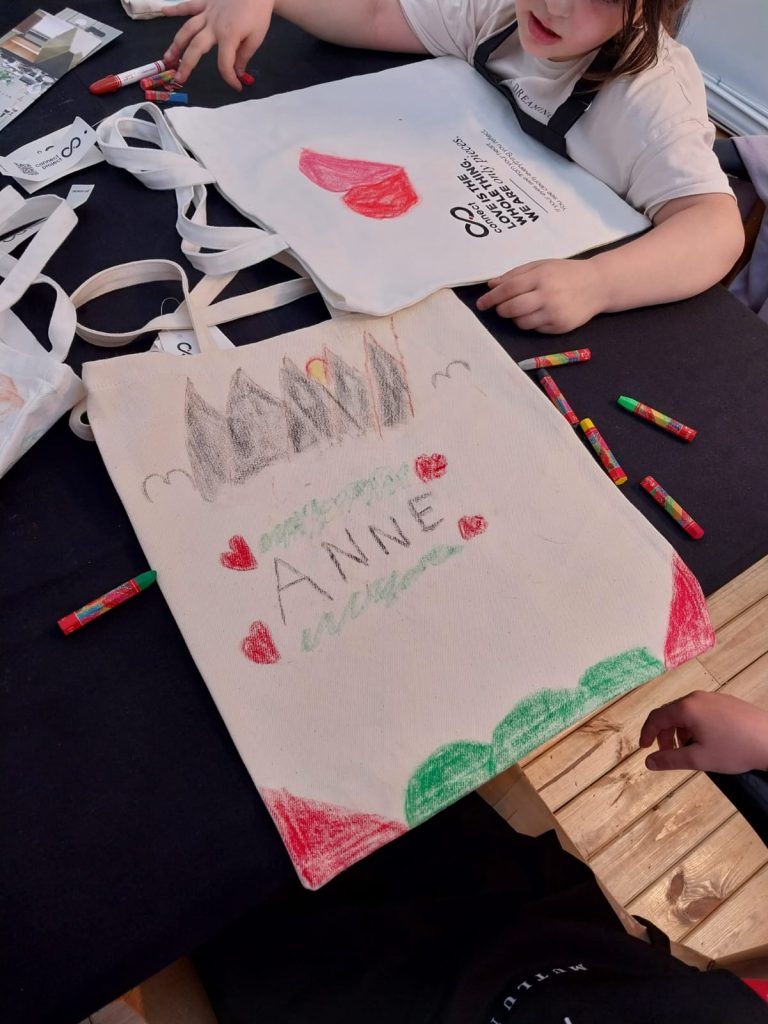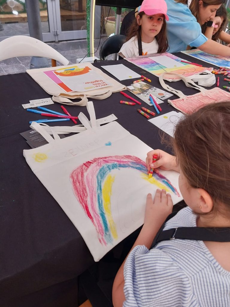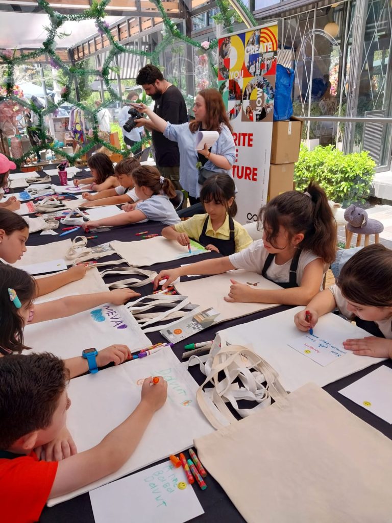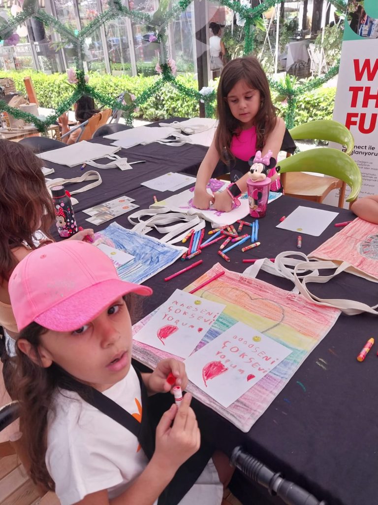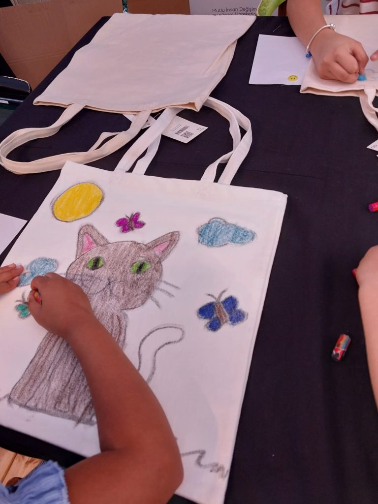 Doğa dostu bez çantaları miniklerimizle beraber tasarlıyor, birlikte boyuyoruz.
